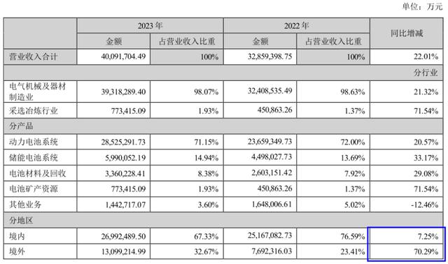 從銷售區(qū)域來看,海外市場已經(jīng)成為推動寧德時代營收增長的關(guān)鍵。據(jù)公司年報數(shù)據(jù)顯示,2023年全年,寧德時代境外市場實現(xiàn)銷售收入1309.92億元,同比增長70.29%,收入占比為32.67%,同比提升了9.16個百分點,毛利率為25.19%。對比看,公司境內(nèi)市場銷售收入為2699.25億元,同比增長7.25%,銷售毛利率為21.8%。