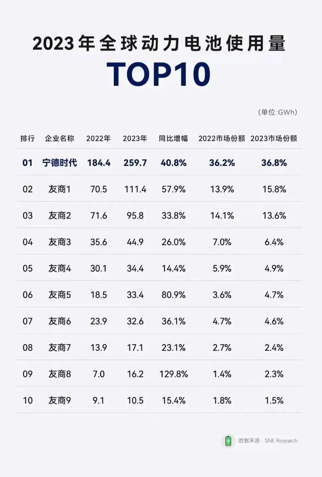 事實上,寧德時代評級之所以能夠獲得上調(diào),與其市場份額的持續(xù)提升不無關(guān)系。《2023年全球動力電池使用數(shù)據(jù)》顯示,2023年寧德時代動力電池使用量達259.7GWh,相較2022年增長40.8%,市場占有率高達36.8%,穩(wěn)居世界第一,比第二名高出近21個百分點。