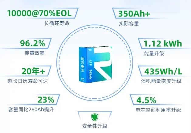 再加上融合電化學固液界面技術等多項創(chuàng)新技術,使得電芯內(nèi)部空間的利用效率得到進一步提升。以問頂345Ah儲能電芯為例,實際容量超350Ah,能量升級至1.12 kWh,體積能量密度升級至440Wh/L,能量效率達96.2%,可減少能量轉(zhuǎn)換損耗降低7%成本,相當于又一次升級了大儲產(chǎn)品力。