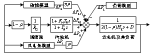 隨著風電滲透率的提升,系統(tǒng)頻率響應(yīng)能力逐漸降低,所以系統(tǒng)頻率響應(yīng)模型中需引入表征風電滲透率的變量。風電滲透率為ρ時,系統(tǒng)頻率響應(yīng)模型如圖1所示。