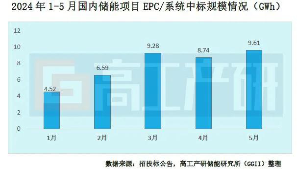 智通財經(jīng)獲悉,依據(jù)GGII發(fā)布的《高工儲能行業(yè)數(shù)據(jù)庫》不完全統(tǒng)計,5月國內(nèi)共有46個儲能項目EPC/系統(tǒng)公布中標(biāo)結(jié)果,中標(biāo)規(guī)模達(dá)9.61GWh,較上月增長10%,1-5月中標(biāo)容量規(guī)模累計達(dá)38.74GWh。