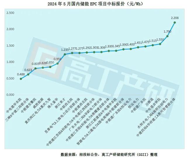 5月,國內(nèi)儲能項目EPC總承包報價在0.488-2.208元/Wh之間,均價為1.174元/Wh,較上月下降11%。最高價來自貴州黔西市100MW/200MWh電網(wǎng)側(cè)集中式共享儲能電站項目EPC總承包,中建四局&華府建工&貴州智睿聯(lián)合體以2.208元/Wh中標(biāo);最低價為中國電建集團(tuán)華東勘測設(shè)計研究院有限公司以0.488元/Wh的價格中標(biāo)舟山定海工業(yè)園區(qū)共享儲能電站項目一期。