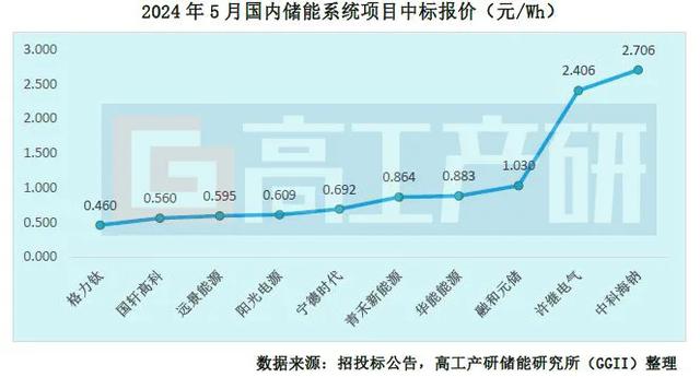 5月中標(biāo)項目包括28個儲能EPC項目,18個儲能系統(tǒng)采購項目。價格方面,儲能系統(tǒng)采購的單價在0.460-2.706元/Wh的范圍內(nèi),均價為0.641元/Wh,較上月下滑10%。最高價來自國能信控現(xiàn)貨市場下多形式先進(jìn)復(fù)合儲能智能協(xié)同控制技術(shù)研究與實證鈉離子電池示范項目,中科海納以2.706元/Wh中標(biāo);最低價來自龍源電力集團(tuán)共享儲能技術(shù)(北京)有限公司第三批儲能電站液冷電池系統(tǒng)框架采購(標(biāo)段一),格力鈦中標(biāo)單價0.460元/Wh。