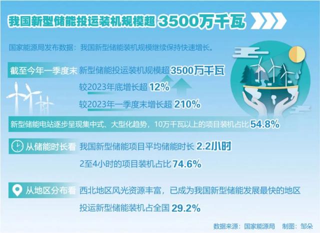 國家能源局發(fā)布數據:我國新型儲能裝機規(guī)模繼續(xù)保持快速增長。截至今年一季度末,新型儲能投運裝機規(guī)模超3500萬千瓦,較2023年底增長超12%,較2023年一季度末增長超210%。