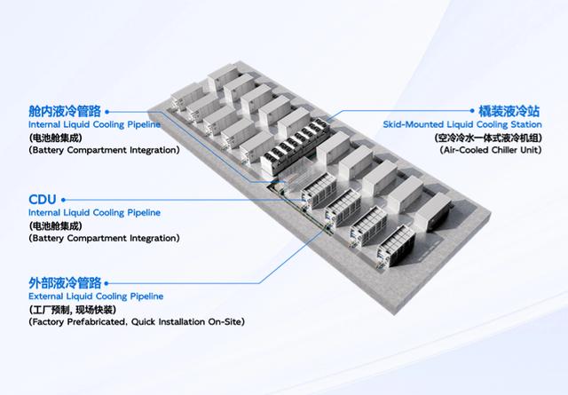 該系統(tǒng)由集中布置的液冷站、布置于電池艙內(nèi)的配水動(dòng)力站(CDU) 、電池艙內(nèi)外液冷管路,以及TMS智控系統(tǒng)組成,其具有空冷冷水一體式液冷機(jī)組和均衡智控 TMS 兩項(xiàng)節(jié)能關(guān)鍵技術(shù):首先是集中式液冷機(jī)組相比分布式液冷機(jī)組全年能效比提高113%,全年節(jié)省能耗大于50%。其次是均衡智控TMS基于負(fù)荷實(shí)時(shí)預(yù)測(cè)、CPC均衡模型等,可精準(zhǔn)預(yù)測(cè)電池系統(tǒng)溫控目標(biāo)曲線(xiàn),實(shí)現(xiàn)電芯均衡冷卻,可使液冷系統(tǒng)冷卻能力輸出峰值降低35%以上,帶來(lái)液冷站配置規(guī)??蓽p小35%或節(jié)能45%,相比于分布式電池艙液冷系統(tǒng)節(jié)能效果顯著,在儲(chǔ)能液冷、數(shù)據(jù)中心液冷等領(lǐng)域都具備良好的應(yīng)用前景。