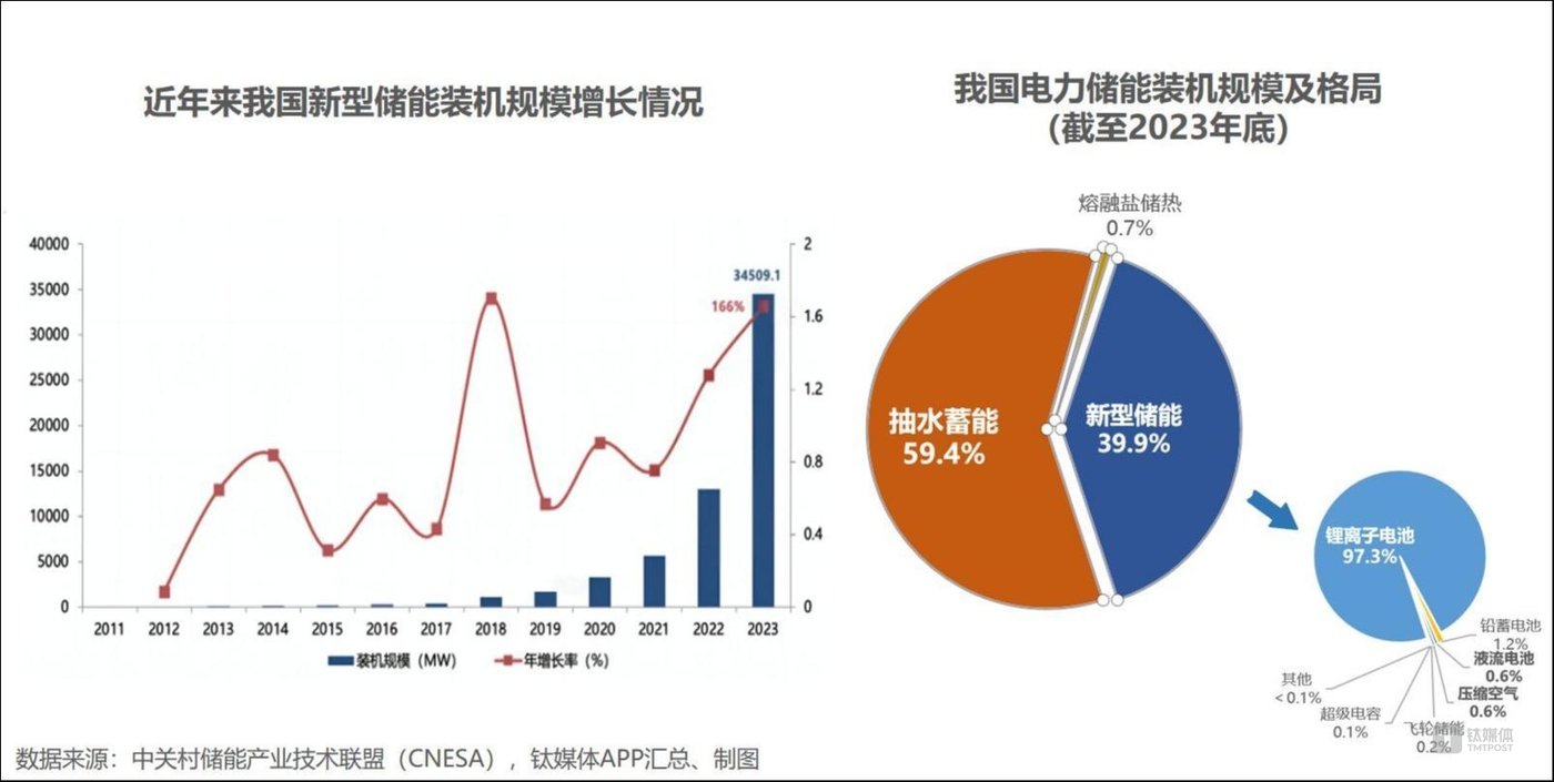 根據(jù)中關(guān)村儲能產(chǎn)業(yè)技術(shù)聯(lián)盟(CNESA)的統(tǒng)計,我國新型儲能市場累計裝機(jī)規(guī)模在2022年就實現(xiàn)了128%的同比增長,2023年更是大增166%。截至2023年底,電力儲能裝機(jī)規(guī)模中已有40%的新型儲能,在2021年還占據(jù)著超過85%市場的傳統(tǒng)抽水蓄能,份額則降至60%以下。而在新型儲能領(lǐng)域,鋰電是絕對主流,截至2023年底,該技術(shù)方向在新型儲能裝機(jī)中占比97.3%。
