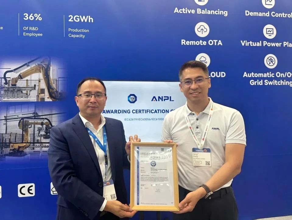 認證展會現(xiàn)場,安瑞哲這款儲能柜獲頒歐洲市場權(quán)威的TüV南德認證證書。南德TüV是世界上規(guī)模最大、最悠久認證機構(gòu)之一,得到全球的廣泛認可。南德TüV對其新品的認同,不僅因為其符合行業(yè)標準,還源于產(chǎn)品的創(chuàng)新設(shè)計。安瑞哲總經(jīng)理張登基介紹,HULK 200具備單體容量可調(diào)控的特點,其單體容量范圍為100~200KWh,多機并聯(lián)可擴展至MWh級容量,靈活配置可滿足不同客戶需求。依托安瑞哲自主研發(fā)的風(fēng)冷系統(tǒng),電池模組和系統(tǒng)的防水等級均有了大幅提升,有力保障了運行安全。創(chuàng)新的散熱板和風(fēng)道設(shè)計確保設(shè)備在各種環(huán)境下都能穩(wěn)定運行,產(chǎn)品既媲美液冷的散熱性能,又保留風(fēng)冷的高效運維。