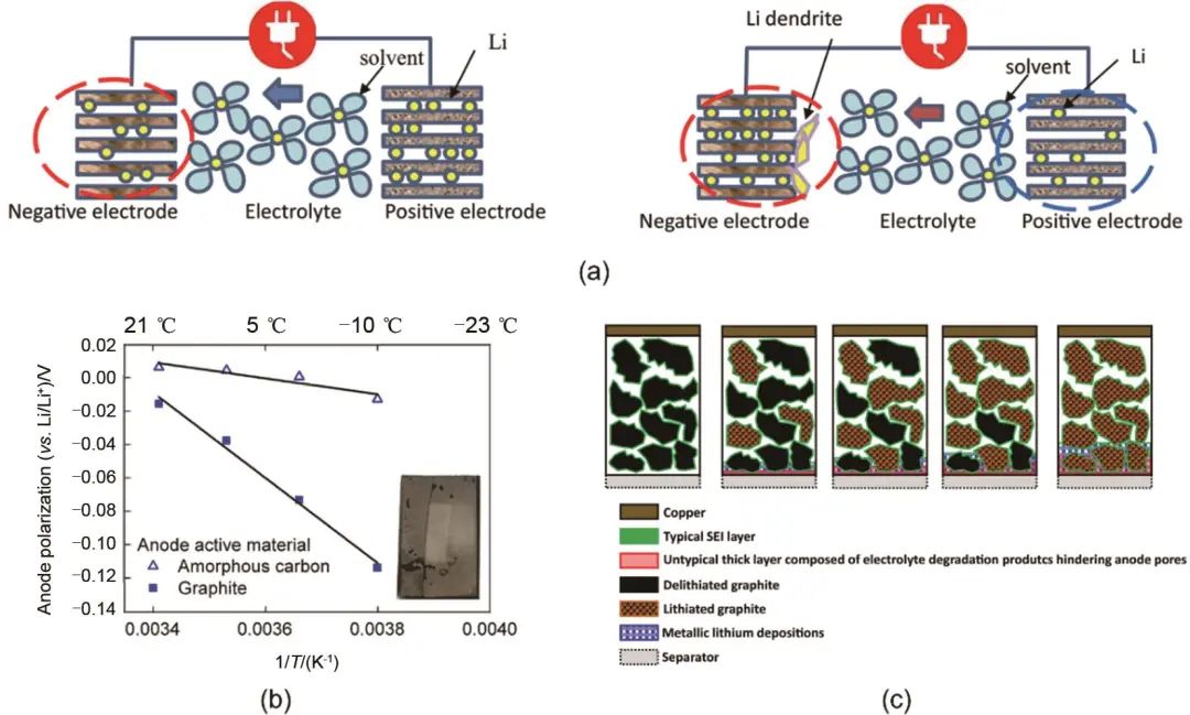 圖3 低溫對石墨負極的影響:(a) 低溫下石墨負極表面發(fā)生鋰沉積的示意圖;