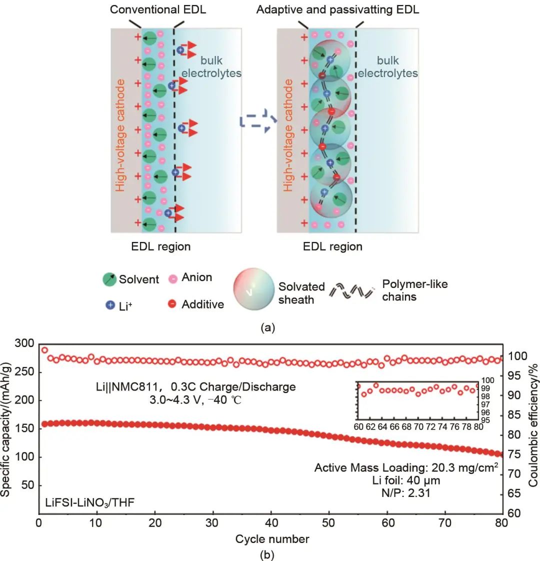 電池中的電極反應都是在電極-電解質界面發(fā)生的,調控鋰離子在電極-電解質界面處的溶劑化結構和電荷轉移行為,加快鋰離子在界面處的離子傳輸和去溶劑化過程,有助于電池實現(xiàn)在低溫下高效穩(wěn)定運行。Zhang等提出了一種加入“刺激響應型”添加劑的在正極/電解液界面構建了動態(tài)高穩(wěn)定雙電層的界面溶劑化結構調控策略。作者篩選了一系列離子尺寸小且與鋰離子具有強結合能力的陰離子作為“刺激響應型”添加劑(例如NO3-、ClO4-、Br-等),如圖11(a)所示,添加劑陰離子在電池充電時,可在電壓驅動下快速遷移到正極界面,添加劑陰離子與鋰離子間的強相互作用使得在正極界面雙電層中形成了特殊的“超分子動態(tài)網絡結構”。在此動態(tài)網絡結構中,添加劑吸引豐富的鋰離子,促進鋰離子在界面處的遷移和從主體電解液中脫去溶劑,并且雙電層處于“富鋰離子-貧電解液”狀態(tài),其內部所有的溶劑分子都參與鋰離子溶劑化,降低了雙電層內溶劑的HOMO能級,將不穩(wěn)定的“自由溶劑”排除出雙電層,顯著提升了正極界面上溶劑的氧化穩(wěn)定性。通過這樣巧妙的電極/電解液界面設計實現(xiàn)了本體醚基電解液和界面電解液的解耦,憑借本體電解液的高離子導電性和界面處快速的電荷轉移機制實現(xiàn)了優(yōu)異的低溫性能。相較于常規(guī)電解液在0 ℃以下迅速下降的低溫性能,添加劑輔助的醚類電解液實現(xiàn)了Li/NMC全電池在-40 ℃下的穩(wěn)定充放電循環(huán)[圖11(b)]。這種利用特殊界面化學來優(yōu)化電解液低溫性能的方式在后期被廣泛關注,研究人員進一步豐富了具有界面調控功能的添加劑類型并對吸附性添加劑在界面的作用機理進行了補充探究。