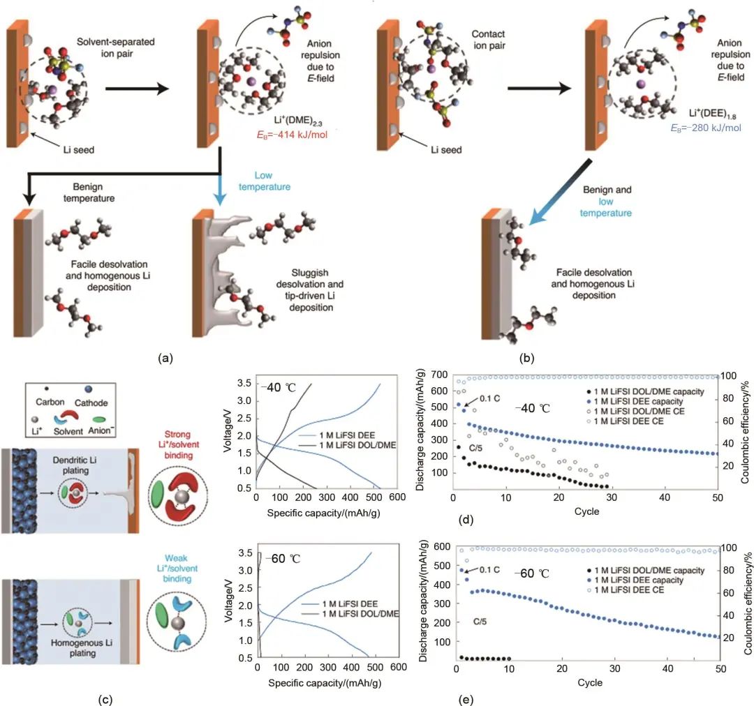 Holoubek等對比了常見的醚基電解液1 mol/L LiFSI DOL-DME和使用弱結合能力溶劑分子乙醚(DEE)的弱溶劑化能電解液1 mol/L LiFSI DEE,如圖7(a)所示,在DME/DOL電解液中,溶劑化結構呈現(xiàn)溶劑分離離子對(SSIP)結構,根據DFT模擬計算結果,這一結構中鋰離子平均與2.3個DME分子配位,即與溶劑的配位數(shù)是4.6 (每個DME分子有2個配位點),溶劑化結構中不存在陰離子,模擬計算得到其溶劑結合能為-414 kJ/mol。而在DEE的電解液中,溶劑化結構呈現(xiàn)接觸離子對(CIP)結構,這一結構中鋰離子平均與1.8個DME分子配位,這明顯低于使用DME電解質的SSIP結構,由于較少的溶劑分子配位,使得陰離子得以進入CIP結構的溶劑化鞘,形成了含有陰離子的溶劑化結構。因此,DEE電解液形成的CIP結構溶劑化鞘具有更低的去溶劑化能壘,模擬計算得到其溶劑結合能為-280 kJ/mol [圖7(b)~(c)]。文章將2種電解液運用在Li/SPAN全電池上,對比其低溫容量和循環(huán)性能。如圖7(d)和圖7(e)所示,DEE電解液在-40 ℃下能實現(xiàn)519 mAh/g的放電容量(84%的室溫容量),而DME電解液只有236 mAh/g (38%的室溫容量),當溫度到達-60 ℃時,DEE電解液仍然能實現(xiàn)474 mAh/g (76%的室溫容量)的放電容量,而DME電解液則只能提供13 mAh/g (約3%的室溫容量)的容量。對比低溫循環(huán)性能,使用DME電解液的電池在-40 ℃下在初始兩個循環(huán)后就迅速下降,在-60 ℃下幾乎完全不能循環(huán),而DEE電解液則能夠穩(wěn)定低溫循環(huán)50圈以上。從電池的低溫性能可以看出,DEE電解液因為具有更低的溶劑結合能,去溶劑化過程中需要跨越的能量屏障更低,更容易發(fā)生去溶劑化過程,從而大大降低了低溫下的電荷轉移電阻和過電勢,提高了電荷傳遞的動力學,顯著提高了電池的低溫容量和循環(huán)性能。雖然具有弱結合能的溶劑分子能夠有效降低去溶劑化所需的能量屏障,但是在這些溶劑的實際使用過程中還需要綜合考慮其電化學穩(wěn)定性、離子導電性、界面成膜性以及安全性等。弱溶劑化的溶劑分子往往會造成鋰鹽陰陽離子的不完全解離,導致電解液的離子電導率明顯下降,且目前常見的弱結合能的溶劑分子例如DEE、1,4-二氧六環(huán)(1,4-DIOX)的電化學窗口都較窄,其氧化穩(wěn)定性較差,在高電壓下溶劑容易發(fā)生分解,這也導致使用這類溶劑的電解液不能與高壓正極適配,只能采用一些低電壓的正極(例如SPAN正極),導致電池能量密度下降。