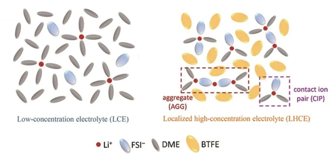近些年來,高濃度電解液(HCEs)受到了廣泛的關注,通過提高電解液中的鋰鹽濃度,使得大量的鋰離子將全部溶劑完全配位,顯著提高溶劑的HOMO能級,提高電解液的電化學穩(wěn)定性。更重要的是當溶劑分子和鋰離子的摩爾比大于4時,溶劑分子不足以和大量的鋰離子完全配位,因此陰離子會“擠”進溶劑化鞘中,形成接觸離子對的CIP結構和聚集離子對的AGG結構,這一存在陰離子的溶劑化結構相較于原有的SSIP結構擁有更低的去溶劑化能壘,并且參與溶劑化的陰離子表現(xiàn)出更低的LUMO能級,在形成SEI/CEI過程中,溶劑化結構中的陰離子會優(yōu)先還原分解,形成含有更多陰離子衍生的無機組分的SEI,其擁有更好的電化學性能和機械穩(wěn)定性、更有利的鋰金屬兼容性,顯著提高鋰金屬負極的循環(huán)穩(wěn)定性。但是HCEs的黏度高、潤濕性差、電導率低等問題使得其在低溫下幾乎不能使用,并且由于超高的鋰鹽黏度,電池的能量密度顯著下降,成本也不可接受,這些都限制了HCEs的實際運用。為了解決HCEs的種種問題,研究人員提出使用非極性的低黏度稀釋劑來稀釋HCEs,非極性稀釋劑與鋰離子沒有相互作用,有效保留HCEs中特殊的CIP和AGG溶劑化結構的同時,可降低鋰鹽濃度和電解質的黏度,提高了整體電解液的電導率。如圖8所示,這種采用稀釋高濃電解液的方式得到的電解液被稱為局部高濃電解液(LHCEs),其保留了HCEs優(yōu)點的同時,極大地改進了HCEs的缺點,并且降低了成本,提高了整體的能量密度。