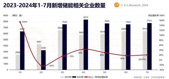 儲能設備相關企業(yè)中,4月新增量最多,達7174家,比去年同期增47.55%;5月、6月、7月新增量有所下滑,維持在6400-6600之間。與2023年同期相比,1月新增幅度最大,增速超1.5倍多。