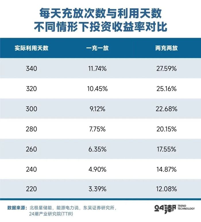 還需要注意的是,據(jù)東吳證券測(cè)算,工商儲(chǔ)實(shí)際應(yīng)用中收益率低于理論值,對(duì)工商業(yè)業(yè)主吸引力有限。工商儲(chǔ)單個(gè)項(xiàng)目功率較大,初始投資成本約上千萬(wàn)元,此外分時(shí)電價(jià)政策變化的不確定性、若實(shí)際利用天數(shù)較低,收益率將打較大折扣,每天同一充放次數(shù)下,220天利用天數(shù)與340天利用天數(shù)可產(chǎn)生近2倍收益率差異??紤]目前實(shí)際利用是一充一放為主,280利用天數(shù)下IRR為7.75%。