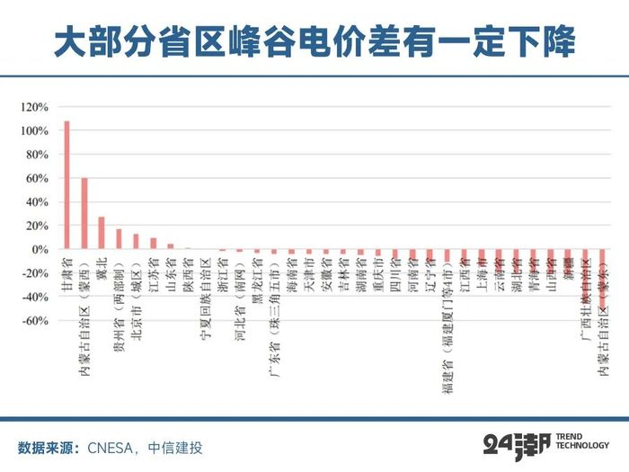 這并非危言聳聽,根據(jù)東海證券統(tǒng)計(jì),今年以來(lái)浙江、河南、江蘇多地發(fā)布分時(shí)電價(jià)調(diào)整政策,全國(guó)范圍內(nèi)峰谷電價(jià)差縮窄趨勢(shì)顯著,河南省分時(shí)電價(jià)調(diào)整新政亦正式落地。此外根據(jù)中關(guān)村儲(chǔ)能聯(lián)盟對(duì)32個(gè)省區(qū)的分析,今年1-8月份一般工商業(yè)1-10kV電網(wǎng)代理購(gòu)電最大峰谷價(jià)差平均為0.68元/kWh,較2023年同比下降了6.7%。與2023年1-8月相比,今年各地最大峰谷價(jià)差普遍呈現(xiàn)下降趨勢(shì),僅甘肅、蒙西、冀北等8個(gè)地區(qū)價(jià)差有所提高,其他地區(qū)均為下降。