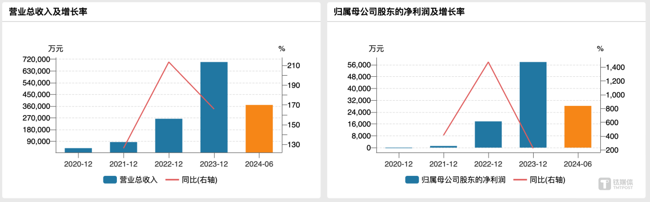業(yè)績是最好的佐證。2021年-2023年,海博思創(chuàng)分別實現(xiàn)營收8.38億元、26.26億元、69.82億元,同比增長126.25%、213.40%、165.89%;歸母凈利潤1126.05萬元、1.77億元和5.78億元,同比增長413.46%、1474.23%和226.13%。今年上半年,公司營收、歸母凈利潤再錄得36.87億元和2.82億元。