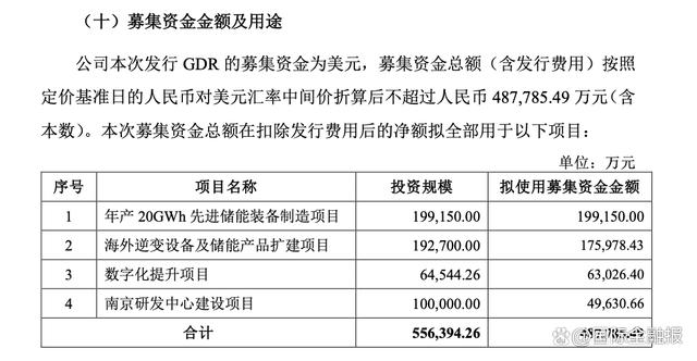 此次發(fā)行GDR的募集資金為美元,募集資金總額(含發(fā)行費(fèi)用)折算后不超過人民幣48.78億元。所募資金在扣除發(fā)行費(fèi)用后,將全部用于年產(chǎn)20GWh先進(jìn)儲能裝備制造項目、海外逆變設(shè)備及儲能產(chǎn)品擴(kuò)建項目、數(shù)字化提升項目以及南京研發(fā)中心建設(shè)項目。