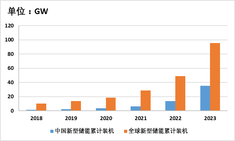 據(jù)統(tǒng)計(jì),2018年以來,中國和全球新型儲能裝機(jī)規(guī)模都在不斷增加。2021年開始,增加幅度更為明顯,2023年中國新型儲能累計(jì)裝機(jī)高達(dá)35GW,全球新型儲能累計(jì)裝機(jī)高達(dá)95GW,具體如圖1-1所示。