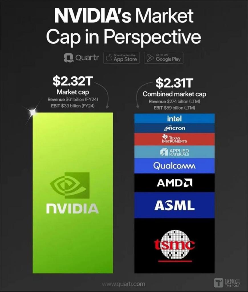 鈦媒體App 5月24日消息,截至今早美股收盤,“AI之王”英偉達(dá)(NASDAQ:NVDA)市值一天內(nèi)暴漲2180億美元(約合人民幣1.56萬(wàn)億元),達(dá)到2.56萬(wàn)億美元市值——超過臺(tái)積電、阿斯麥、AMD、高通、應(yīng)用材料、德州儀器、美光科技、英特爾等半導(dǎo)體巨頭的市值總和。同時(shí),股價(jià)也首次沖破1000美元/股,創(chuàng)下歷史新高。