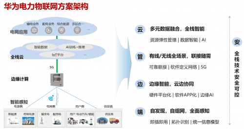 華為構(gòu)建了“云管邊端”的電力物聯(lián)網(wǎng)方案架構(gòu),并且由端到云全棧技術(shù)安全可控?!霸啤庇蒊oT平臺(tái)、智能數(shù)據(jù)和AI共同構(gòu)建數(shù)字化底座,并支撐電網(wǎng)業(yè)務(wù)云化應(yīng)用;“管”提供可靠聯(lián)接,有線(xiàn)/無(wú)線(xiàn)全場(chǎng)景隨需靈活聯(lián)接;“邊”具備邊緣計(jì)算、云邊協(xié)同和AI能力;“端”全面感知電網(wǎng)信息,支持自描述、自發(fā)現(xiàn)和即插即用。