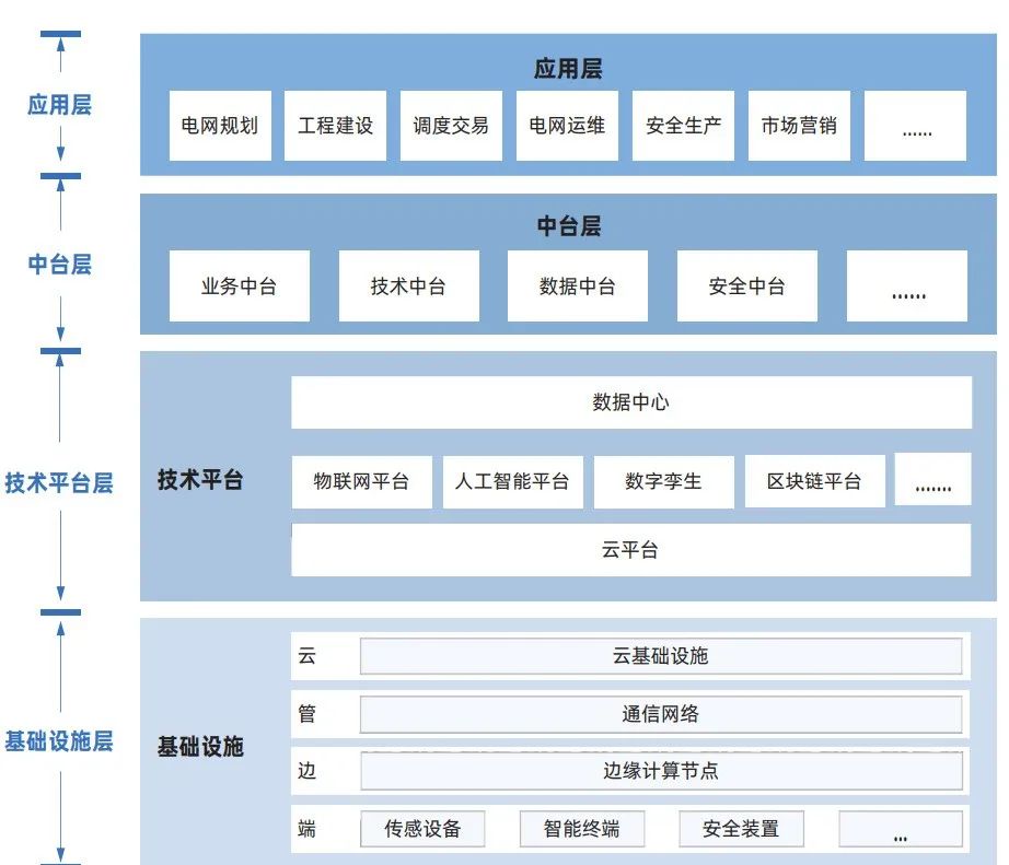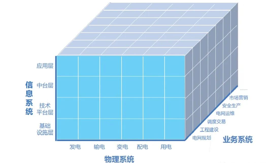 數(shù)字電網(wǎng)技術(shù)體系按照數(shù)字電網(wǎng)理論模型,由物理系統(tǒng)、信息系統(tǒng)、業(yè)務(wù)系統(tǒng)構(gòu)成。如下圖的三維立體結(jié)構(gòu)描述了數(shù)字電網(wǎng)技術(shù)體系架構(gòu),物理系統(tǒng)以發(fā)、輸、變、配、用為主線(xiàn),業(yè)務(wù)系統(tǒng)分為電網(wǎng)規(guī)劃、工程建設(shè)、調(diào)度交易、電網(wǎng)運(yùn)維、安全生產(chǎn)、市場(chǎng)營(yíng)銷(xiāo)、人財(cái)物管理、黨政工團(tuán)等方面;信息系統(tǒng)包 括基礎(chǔ)設(shè)施層、技術(shù)平臺(tái)層、中臺(tái)層、應(yīng)用層。