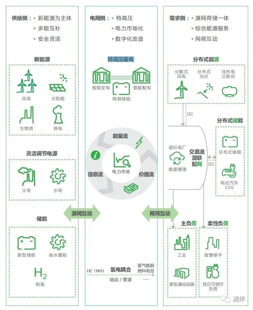 與傳統(tǒng)電力系統(tǒng)相比,它強調(diào)的是以“新能源”為主體,逐步提升光伏、風電等新能源發(fā)電的比例,并通過電網(wǎng)系統(tǒng)運行的變革,實現(xiàn)新能源高效開發(fā)利用和各類負荷的友好接入,提升終端電氣化率,通過發(fā)電、輸電、配電、用電等各環(huán)節(jié)的共同發(fā)力,最終實現(xiàn)電力行業(yè)減排降碳目標。可以說,新型電力系統(tǒng)是我們邁向碳達峰碳中和的關(guān)鍵所在。