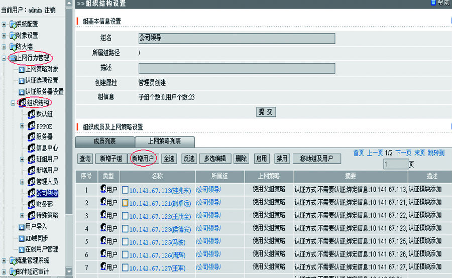 內(nèi)網(wǎng)管理一般通過(guò)路由模式或橋接模式將硬件連接到網(wǎng)絡(luò)出口,并通過(guò)內(nèi)網(wǎng)管理系統(tǒng)進(jìn)行網(wǎng)絡(luò)監(jiān)控。首先要通過(guò)內(nèi)網(wǎng)管理系統(tǒng)將上網(wǎng)賬戶規(guī)劃到不同的組織結(jié)構(gòu),針對(duì)不同組織結(jié)構(gòu)進(jìn)行策略配置。如圖1、圖2、圖3所示。
