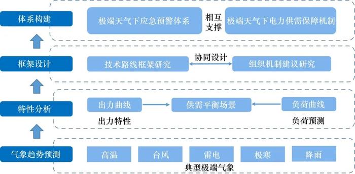 新能源出力具有波動性,高比例新能源接入的新型電力系統(tǒng),其功率和能量靈活平衡需求顯著提高;極端天氣頻發(fā)趨勢將進一步放大新能源發(fā)電隨機性及波動性對電力系統(tǒng)安全運行的不利影響。針對全球氣候變暖趨勢,研究我國大型新能源基地、負荷中心等送受端地區(qū)的極端氣象特征與演變趨勢,揭示典型極端氣象場景影響電力供給及負荷需求側(cè)的作用機理與傳導機制。結(jié)合高溫、臺風、雷電等極端天氣的歷史事件,新能源的出力特性、負荷特性,分析極端天氣頻發(fā)條件下的電力供需平衡場景與風險;從組織、管理、技術等維度,形成應對極端氣象的電力供需保障技術框架與應急組織機制(見圖4)。