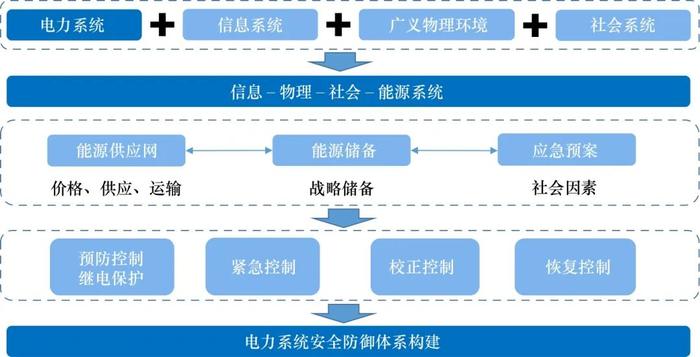 在信息物理社會系統(tǒng)框架方面,采用機理分析和沙盤推演手段,開展極端事件、綜合能源、政策機制、規(guī)劃運行的“時 ? 空 ? 物”要素分析;研究不確定性因素對能源 ? 電力可靠性及經(jīng)濟性的影響規(guī)律,構建覆蓋電力系統(tǒng)運行過程,具有多類目標、多道防線能力的電力安全主動防御體系。