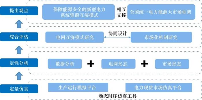 在資源配置模式方面,采取定量仿真、定性分析、綜合評估等方式,根據(jù)生產(chǎn)運行模擬平臺、電力現(xiàn)貨市場仿真平臺的結果,融合電網(wǎng)形態(tài)及市場形態(tài)數(shù)據(jù)分析,論證形成新型能源體系下電網(wǎng)互濟模式及相應的市場支撐機制,從而構建新型電力系統(tǒng)資源互濟模式、全國統(tǒng)一電力能源大市場框架相互支撐的大范圍共享互濟體系。
