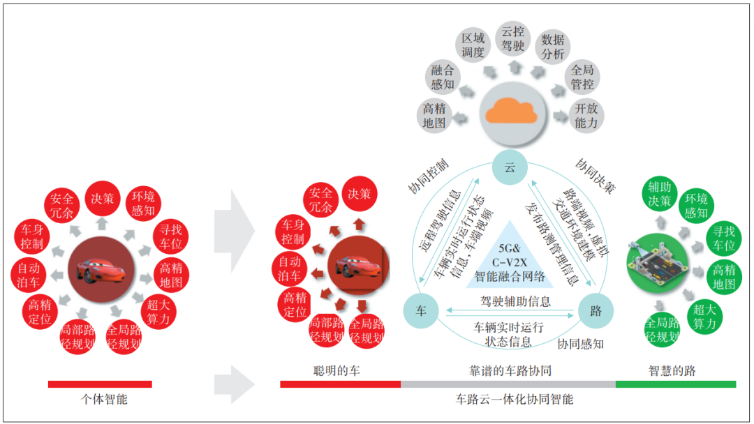 隨著車輛智能化水平的不斷提高,車載計算設備的算力逐漸難以滿足復雜路況下實時處理大量數(shù)據(jù)的需求,既是成本瓶頸,也是能力瓶頸。為解決這一問題,行業(yè)研究出車路云一體化的技術演進路線(見圖5)。此方案體系下,車輛通過高速穩(wěn)定的通信網(wǎng)絡與云端服務器、道路感知設備進行實時數(shù)據(jù)交互。云端強大的計算能力既可對車輛上傳的大量傳感器數(shù)據(jù)進行快速處理和分析,也可處理道路感知設備上報的實時道路信息和交通狀況。平臺綜合分析后將決策指令及時反饋給車輛,從而輔助車輛做出更精準的決策。車路云一體化的技術方案可有效彌補車輛自身算力不足,進一步提升智能網(wǎng)聯(lián)車輛的運行效率和安全性,并為降低智能駕駛成本推動智能網(wǎng)聯(lián)汽車快速普及,助力智能交通發(fā)展提供堅實基礎。