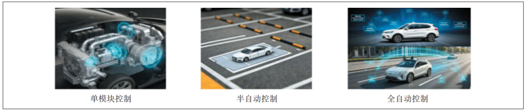 智能網(wǎng)聯(lián)汽車的技術演進歷程一般分為3個階段(見圖4)。第1階段是單模塊控制階段,車輛各個關鍵部件如動力系統(tǒng)、制動系統(tǒng)等都各自配備獨立的控制模塊,模塊之間協(xié)同性較差,只能實現(xiàn)基礎、相對簡單的功能,例如簡單的定速巡航,車輛無法自主應對復雜路況;第2階段是半自動控制階段,部分駕駛任務可以由車輛自動完成,例如記憶泊車功能,車輛能夠自動識別停車位并精準控制轉向、速度等完成泊車動作,但仍需要駕駛員參與;第3階段是全自動控制階段,車輛已達成真正意義上的高度智能化與自主化。車輛依托自身及周邊環(huán)境多傳感器融合技術構建起全方位、高精度的環(huán)境感知體系,并基于云端智能網(wǎng)聯(lián)平臺的強大賦能,具備強大的駕駛決策能力,可實時調整行駛策略以應對復雜多變交通場景,全程無需駕駛員任何干預。