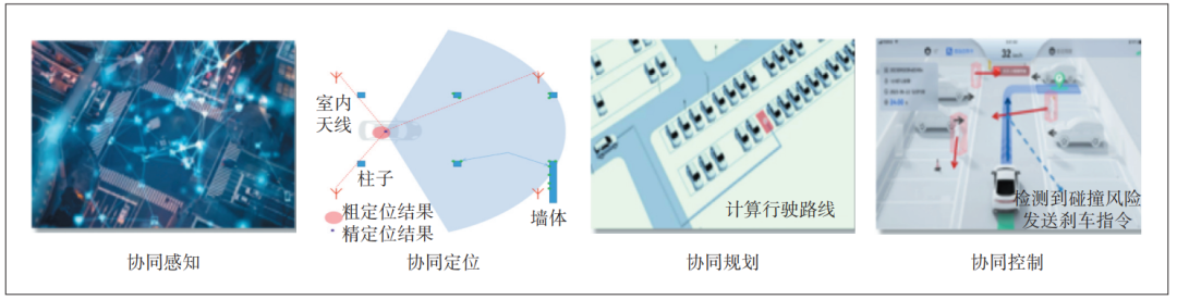 典型場景如智慧泊車,通過協(xié)同感知、協(xié)同定位、協(xié)同規(guī)劃和協(xié)同控制等技術實現(xiàn)高效、智能的停車管理和服務(見圖1)。智慧泊車的技術核心是根據(jù)多源傳感器異構算法聯(lián)合感知的異步動態(tài)協(xié)同感知系統(tǒng),基于場側的無線通信技術和車輛即時定位與地圖構建技術的協(xié)同定位系統(tǒng),同時基于先驗地圖和實時路況的全局路徑調度和車輛感知的局部軌跡規(guī)劃的協(xié)同系統(tǒng),以及場端原始感知數(shù)據(jù)及預測與車輛實時規(guī)劃軌跡的實時干涉控制系統(tǒng),實現(xiàn)車路云一體化的泊車服務。