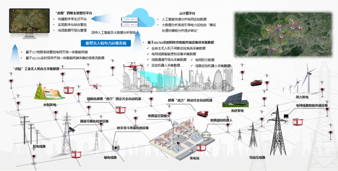無(wú)人機(jī)及全自動(dòng)機(jī)場(chǎng)系統(tǒng)可以實(shí)現(xiàn)網(wǎng)格化、集群化部署,通過(guò)基于PMS3.0設(shè)備管理體系的四維全息管控平臺(tái)和全自主無(wú)人機(jī)、全自動(dòng)機(jī)場(chǎng)組成的智能化不間斷電力巡檢系統(tǒng),統(tǒng)一集中管控調(diào)度,全面實(shí)現(xiàn)全自動(dòng)機(jī)場(chǎng)之間的蛙跳、對(duì)飛、同步作業(yè)等集群作業(yè)模式,高效完成作業(yè)任務(wù)。全面助力電網(wǎng)“數(shù)字新基建”建設(shè),為電網(wǎng)輸、變、配場(chǎng)景保電工作提供7×24小時(shí)不間斷有力巡檢支撐,為電力的安全與穩(wěn)定保駕護(hù)航,最終實(shí)現(xiàn)電力巡檢工人足不出戶,即可全自主不間斷地完成電力智能巡檢,一鍵獲取電力巡檢報(bào)告。
