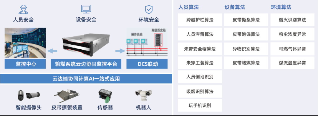 方案通過(guò)云邊端協(xié)同架構(gòu)把智能采集裝置、皮帶撕裂識(shí)別裝置、環(huán)境傳感器等進(jìn)行數(shù)據(jù)的統(tǒng)一匯聚分析,對(duì)異常情況進(jìn)行識(shí)別和報(bào)警,并通過(guò)DCS系統(tǒng)控制聯(lián)動(dòng),提高人員、設(shè)備、環(huán)境的安全管理水平。 在設(shè)備故障監(jiān)測(cè)方面,可對(duì)皮帶異物、落煤口堵煤、皮帶跑偏、運(yùn)行環(huán)境火花等情況進(jìn)行識(shí)別,避免異物運(yùn)輸對(duì)皮帶造成意外損傷或引發(fā)事故;在人員安全管控方面,設(shè)置吸煙、安全帽佩戴、翻越護(hù)欄、人員倒地等相關(guān)算法,對(duì)巡檢人員的不安全行為進(jìn)行識(shí)別管控;在環(huán)境監(jiān)控方面,通過(guò)安裝布設(shè)有毒有害氣體監(jiān)測(cè)傳感器、溫度傳感器、粉塵監(jiān)測(cè)傳感器等對(duì)輸煤環(huán)境進(jìn)行在線(xiàn)實(shí)時(shí)監(jiān)測(cè),及時(shí)發(fā)現(xiàn)高溫、有毒有害氣體超標(biāo)、粉塵濃度超標(biāo)并預(yù)警,最大程度保障人員操作環(huán)境安全。