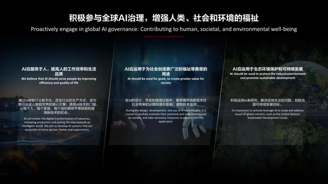 我們認為AI應(yīng)服務(wù)于人,提高人的工作效率和生活品質(zhì),通過AI使能行業(yè)數(shù)字化,改變行業(yè)的生產(chǎn)方式,成為各行業(yè)進入智能世界的核心引擎;要持續(xù)降低AI的技術(shù)門檻,讓每個人、每個家庭、每個組織擁有平等獲取和使用新技術(shù)的機會。同時,AI應(yīng)運用于為社會創(chuàng)造更廣泛的福祉等善意的用途,在AI的設(shè)計、開發(fā)和使用過程中,要審慎評估新技術(shù)對社會帶來的長期和潛在影響,避免技術(shù)濫用。以及,AI應(yīng)運用于生態(tài)環(huán)境保護和可持續(xù)發(fā)展,積極運用AI來研究、解決全球關(guān)注的問題,如聯(lián)合國可持續(xù)發(fā)展目標。