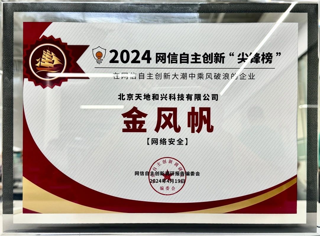 在報(bào)告發(fā)布之際,報(bào)告編委會(huì)推選了具有突出創(chuàng)新能力、取得顯著創(chuàng)新成果、能夠代表創(chuàng)新水平、做出卓越創(chuàng)新貢獻(xiàn)的企業(yè)等予以表彰。天地和興作為在網(wǎng)信自主創(chuàng)新大潮中乘風(fēng)破浪的企業(yè),被授予2024網(wǎng)信自主創(chuàng)新尖鋒榜“金風(fēng)帆獎(jiǎng)”。