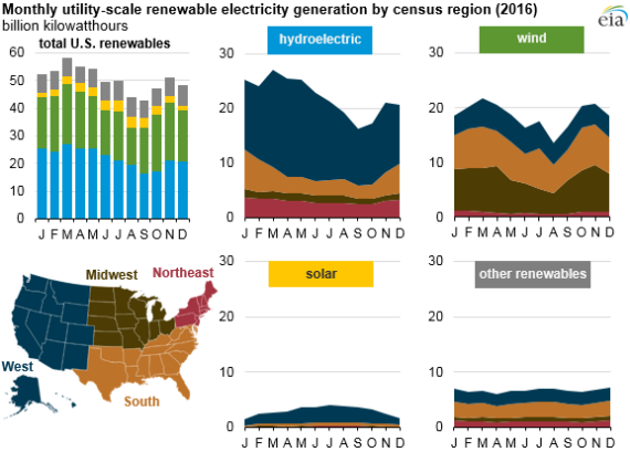 從發(fā)電量來看,今年3月份,美國可再生能源發(fā)電量達到全年最高。從地方來看,大部分可再生能源來自西部地區(qū),尤其是水電(占63%)和太陽能發(fā)電(占77%)。風(fēng)電產(chǎn)業(yè)相對發(fā)展比較均衡,中部地區(qū)占37%,南部占35%,西部占24%,東北部地區(qū)占4%。
