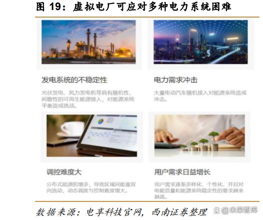 虛擬電廠具有需求側(cè)響應(yīng)、多負荷管理等多種功能,可應(yīng)對發(fā)電系統(tǒng)多樣化困難。虛擬 電廠可以應(yīng)對發(fā)電系統(tǒng)不穩(wěn)定性(風(fēng)光隨機性和間歇性對能源系統(tǒng)平衡造成挑戰(zhàn))、電力需 求沖擊(大量電動汽車隨機接入,對能源系統(tǒng)造成沖擊)、調(diào)控難度大(分布式能源增多, 導(dǎo)致動態(tài)調(diào)度與控制難度提升)和用戶需求日益提升等多種困難。