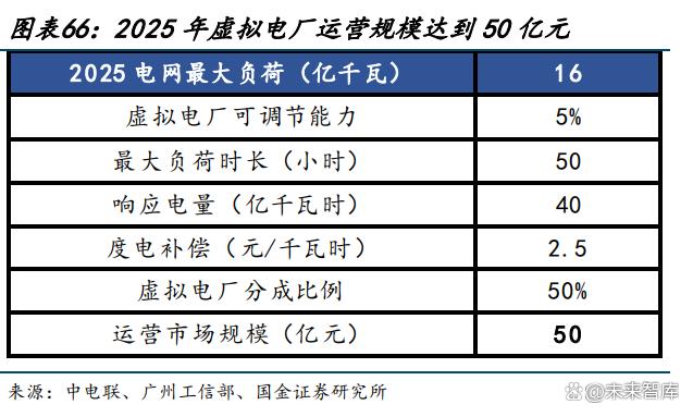 預計 2025 年虛擬電廠投資規(guī)模達到 800 億元,運營市場規(guī)模達到 50 億元?,F(xiàn)階段主要 的盈利模式為通過需求側(cè)響應賺取輔助服務費用后的分成。據(jù)中電聯(lián)預計,2025 年我國 全社會用電量將達 9.5 萬億千瓦時,而最大負荷將達到 16 億千瓦,按 5%可調(diào)節(jié)能力、投 資成本 1000 元/千瓦計算,預計到 2025 年,虛擬電廠投資規(guī)模有望達 800 億元。參考目 前峰值負荷時長水平,我們預計 2025 峰值負荷將達到 50 小時,對應 2025 年電網(wǎng)需求側(cè) 響應電量 40 億千瓦時。目前我國虛擬電廠處于發(fā)展初期,度電補償較高以刺激時長,參 考《廣州市虛擬電廠實施細則》0-5 元/千瓦時的削峰響應補貼,預計 2025 年虛擬電廠進 入商業(yè)化運營后,補償標準為 2.5 元/千瓦時。假設分成比例為 50%,則預計 2025 年虛擬 電廠運營市場規(guī)模將達到 50 億元。