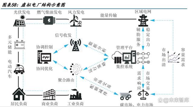 虛擬電廠本質(zhì)上是一套軟件平臺系統(tǒng),核心為“通信”和“聚合”。通過先進信息通信技 術(shù)和軟件系統(tǒng),實現(xiàn)分布式電源、儲能系統(tǒng)、可控負荷、電動汽車等分布式能源資源的聚 合和協(xié)調(diào)優(yōu)化,以作為一個特殊電廠參與電力市場和電網(wǎng)運行的電源協(xié)調(diào)管理系統(tǒng),為配 電網(wǎng)和輸電網(wǎng)提供管理和輔助服務。虛擬電廠概念的核心可以總結(jié)為“通信”和“聚合”, 關(guān)鍵技術(shù)主要包括協(xié)調(diào)控制技術(shù)、智能計量技術(shù)以及信息通信技術(shù)。 虛擬電廠分為兩類:“負荷類”虛擬電廠,和“源網(wǎng)荷儲一體化”虛擬電廠。1)“負荷類” : 聚合了具備調(diào)節(jié)能力的電動汽車、充電樁等市場化用戶,作為一個整體,對外提供負荷側(cè) 靈活性相應調(diào)節(jié)服務。2)“源網(wǎng)荷儲一體化”:聚合新能源發(fā)電、用戶及配儲一系列環(huán)節(jié), 作為獨立市場主體參與電力市場、具備自主調(diào)峰調(diào)節(jié)能力。 具備“源-荷”雙重身份,有效實現(xiàn)削峰填谷。虛擬電廠把各類可調(diào)負荷資源匯聚,根據(jù) 電網(wǎng)削峰填谷的需求,進行線上填報,計劃下發(fā),執(zhí)行反饋,類似于線上工單派單系統(tǒng)。 電網(wǎng)給調(diào)度指令計劃,需求響應調(diào)控計劃,提前幾天/幾周把計劃發(fā)下來。負荷集成商, 虛擬電廠運營商,會把計劃告訴客戶,哪些時段把負荷停掉,把用電負荷降下來,具有源 -荷雙重身份。
