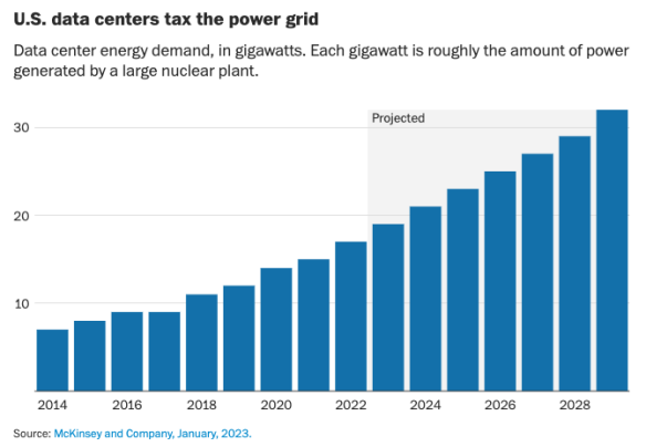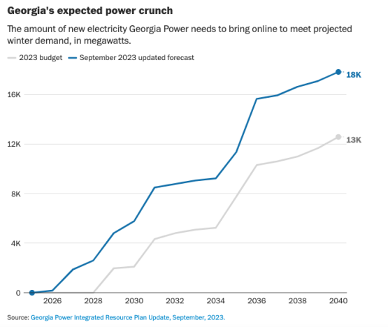 在佐治亞州,對工業(yè)電力的需求正在飆升至歷史新高,預(yù)計(jì)未來十年的新增用電量將是現(xiàn)在的17倍。亞利桑那州公共服務(wù)公司是該州最大的公用事業(yè)公司,它預(yù)計(jì)如果不進(jìn)行重大升級,21世紀(jì)末將嚴(yán)重缺電。弗吉尼亞州北部所有計(jì)劃和在建的新數(shù)據(jù)中心需要幾個大型核電站才能保障供電。德克薩斯州在炎熱的夏季電力短缺已經(jīng)成為常態(tài),也面臨著同樣的困境。
