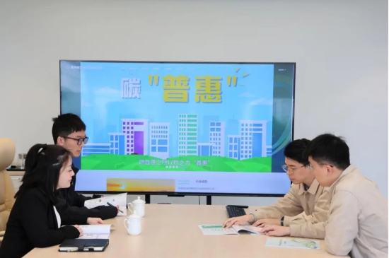 蘇州供電公司碳普惠運(yùn)營(yíng)團(tuán)隊(duì)成員為客戶介紹一站式碳中和服務(wù)。