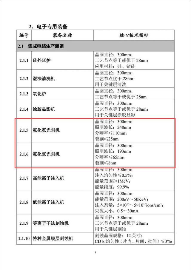 《目錄》中的電子專(zhuān)用裝備目錄下提到,集成電路生產(chǎn)設(shè)備方面包括化氟化氪光刻機(jī),光源248納米,分辨率≤110nm,套刻≤25nm;氟化氬光刻機(jī),光源193納米,分辨率≤65nm,套刻≤8nm。