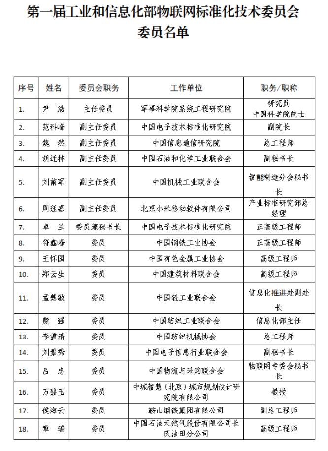 附件:第一屆工業(yè)和信息化部物聯(lián)網(wǎng)標(biāo)準(zhǔn)化技術(shù)委員會委員名單