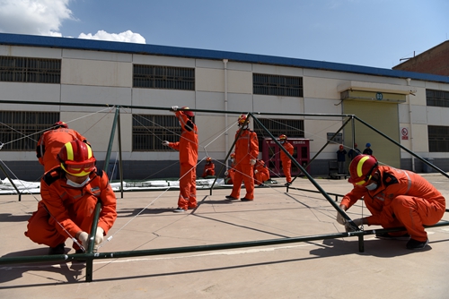 經(jīng)過20多分鐘的應(yīng)急演練,兩座防震帳篷按要求迅速搭建成功,1名受傷人員在緊急醫(yī)療救護后被迅速送往醫(yī)院。隨后,演習指揮部詳細檢查了防震帳篷搭設(shè)情況,聽取了各搶險隊伍巡檢匯報。