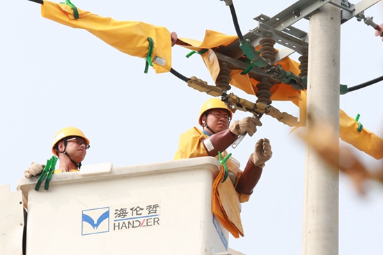 中國電力網(wǎng)訊 8月11日,在濰坊壽光市胡二村,國網(wǎng)壽光市供電公司帶電作業(yè)人員冒著潮濕悶熱天氣,對10千伏胡營線塑料支線09號桿帶電更換隔離刀閘,同時對10千伏顏方線81號桿帶電校正歪斜瓷瓶,全面消除線路運行隱患,保障初秋時節(jié)居民用電安全。