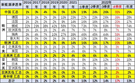 世界新能源車滲透率總體呈現(xiàn)快速提升趨勢,2022年已經(jīng)達(dá)到13%水平,其中中國新能源滲透率達(dá)到25%,德國達(dá)到28%,挪威達(dá)到74%,美國僅有7%,日本僅有2%,因此世界新能源發(fā)展的不均衡性極為明顯。隨著美國加大新能源的鼓勵政策,世界新能源車進(jìn)入強(qiáng)勢發(fā)展的新階段。