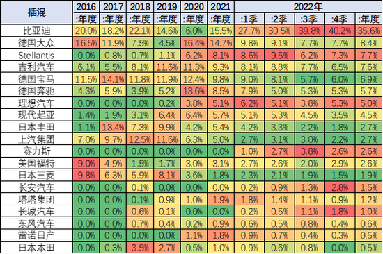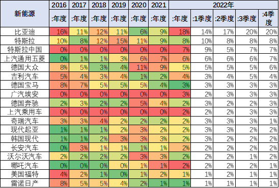 從車企的純電動份額來看,比亞迪的份額總體來看持續(xù)上升,從2017-2021年總體保持在7%以上的份額水平,但2022年的份額上升到12%,表現(xiàn)良好。