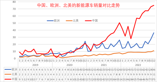 根據(jù)全國乘聯(lián)會數(shù)據(jù):中國2022年1-12月的銷量649萬臺,大幅超越歐洲的247萬和北美洲的103萬的銷量,中國新能源車優(yōu)勢明顯。