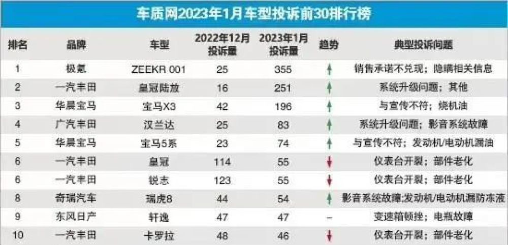 但另一方面,根據(jù)車質(zhì)網(wǎng)公布的2023年1月車型投訴排行榜,極氪001在1月份以355單的投訴量“榮登榜首”,登榜原因主要集中在銷售欺詐、承諾不兌現(xiàn)以及新車座椅鼓包等問題,極氪如果想要在汽車市場上走得更遠(yuǎn),這個售前售后的問題及時給消費(fèi)者解決。